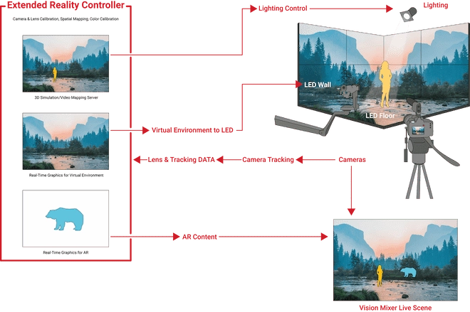 Extended Reality (XR) is the combination of Augmented Reality (AR) and Mixed Reality (MR). AR places virtual imagery over a live background, while MR combines camera tracking and real-time rendering to create an immersive virtual environment, visible live on the LED set and shot on camera. With XR, you can implement extremely complex visual effects to any audiovisual production, even live broadcast. You can use this technology in innumerable ways, as any media that uses cameras can upgrade to XR to further improve their audience’s experience.