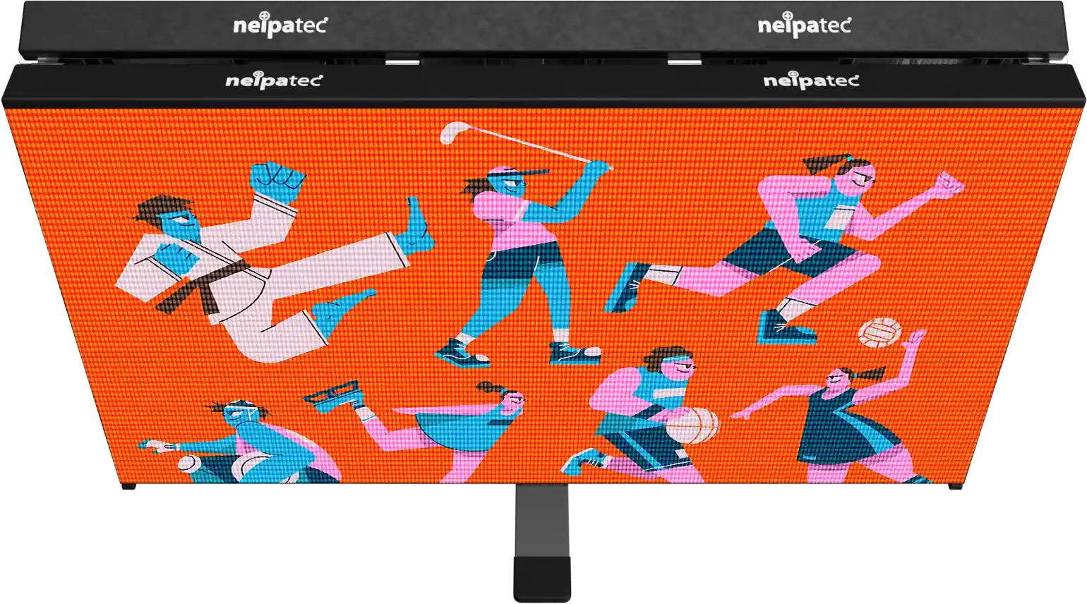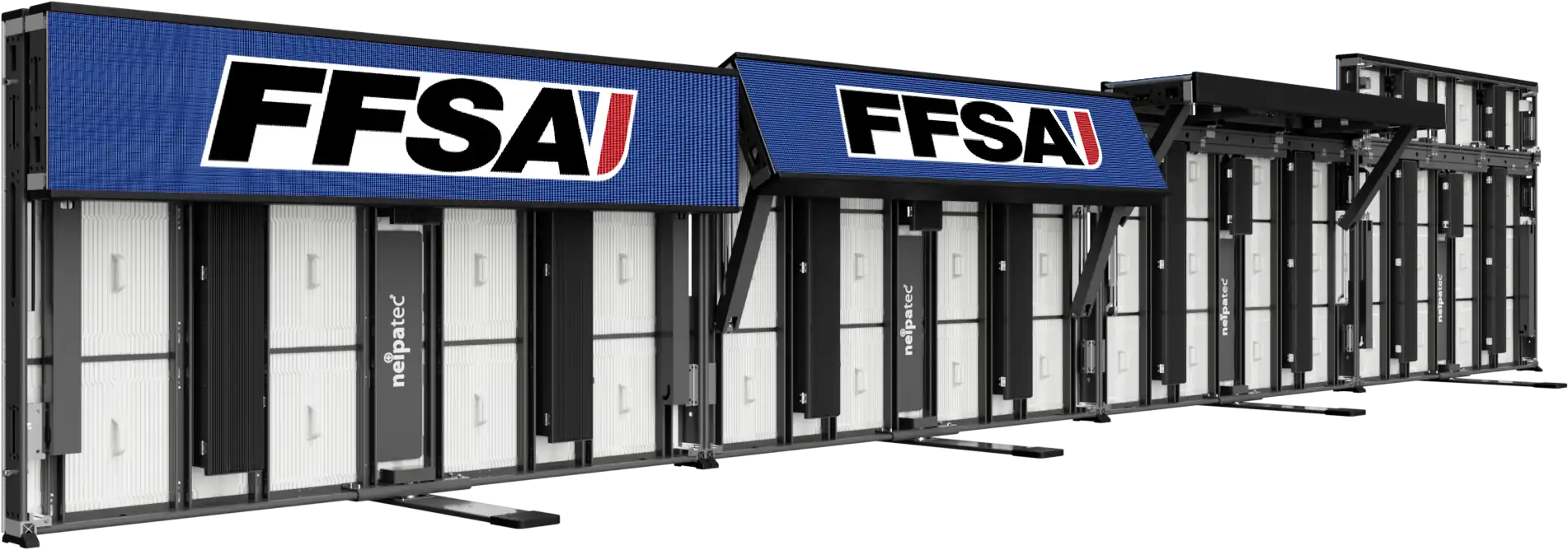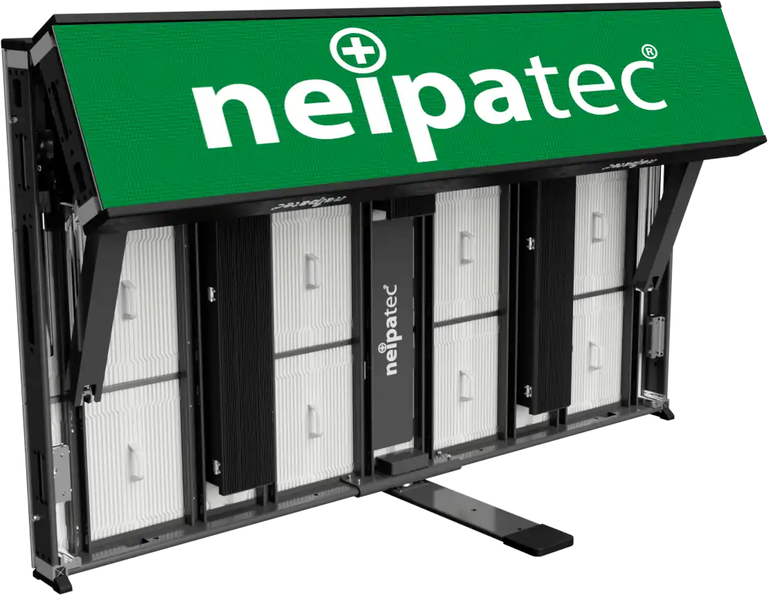 The NEIPATEC® ST Duo offers two stacked display surfaces: a main 900 mm-high area and a 300 mm upper strip. This configuration increases sponsor visibility and enables new content formats while complying with TV broadcast framing requirements. In addition, the 300 mm upper strip can be folded backward to provide an additional display surface facing the stands.