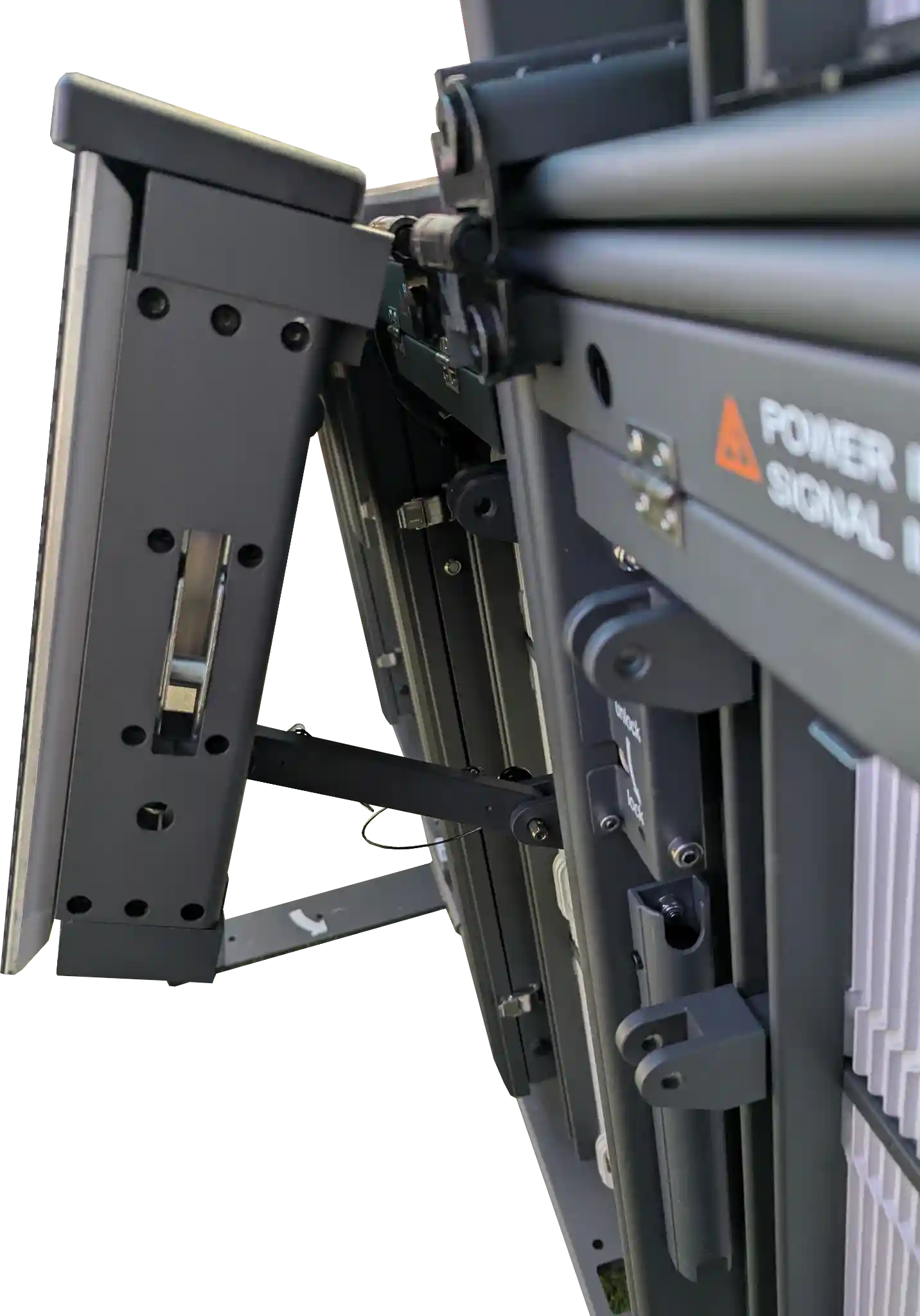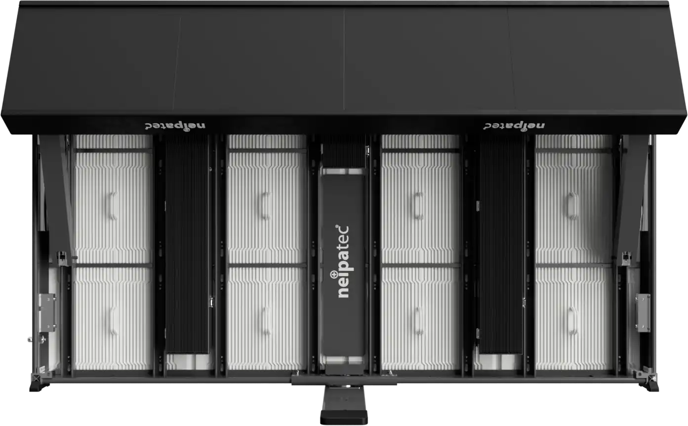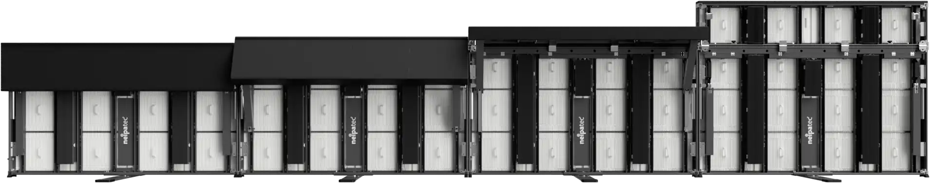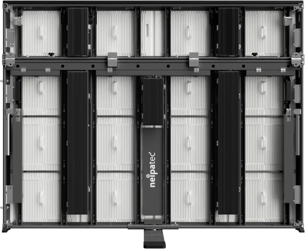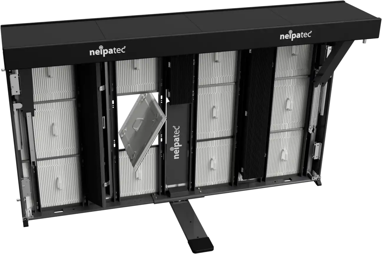 The NEIPATEC® ST Duo’s rotating foot system and support arms ensure quick and stable installation on all types of surfaces. Front and rear maintenance is fully preserved: the modules remain accessible from the front, while the back of the cabinet and the power supplies can be easily reached for technical servicing.
